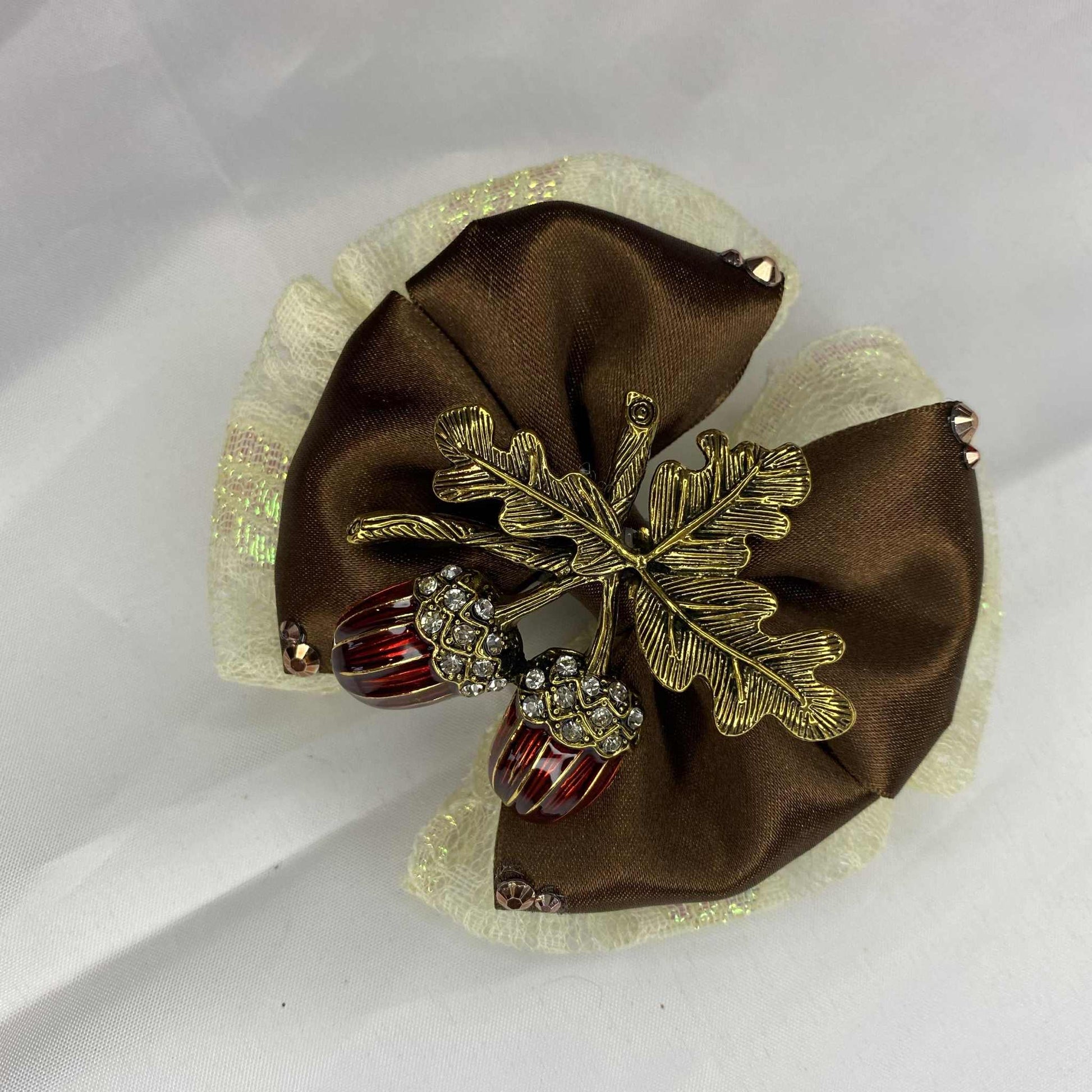The Acorn Essence bow is an elegant accessory ideal for autumn and winter seasons. Crafted with a luxurious triple-layer design, it combines cream lace with rich chocolate brown satin for a sophisticated look. Each corner is adorned with brown diamantes, while a distinctive acorn centerpiece adds a refined seasonal touch. Perfect for adding subtle charm and warmth to your outfit during colder months.