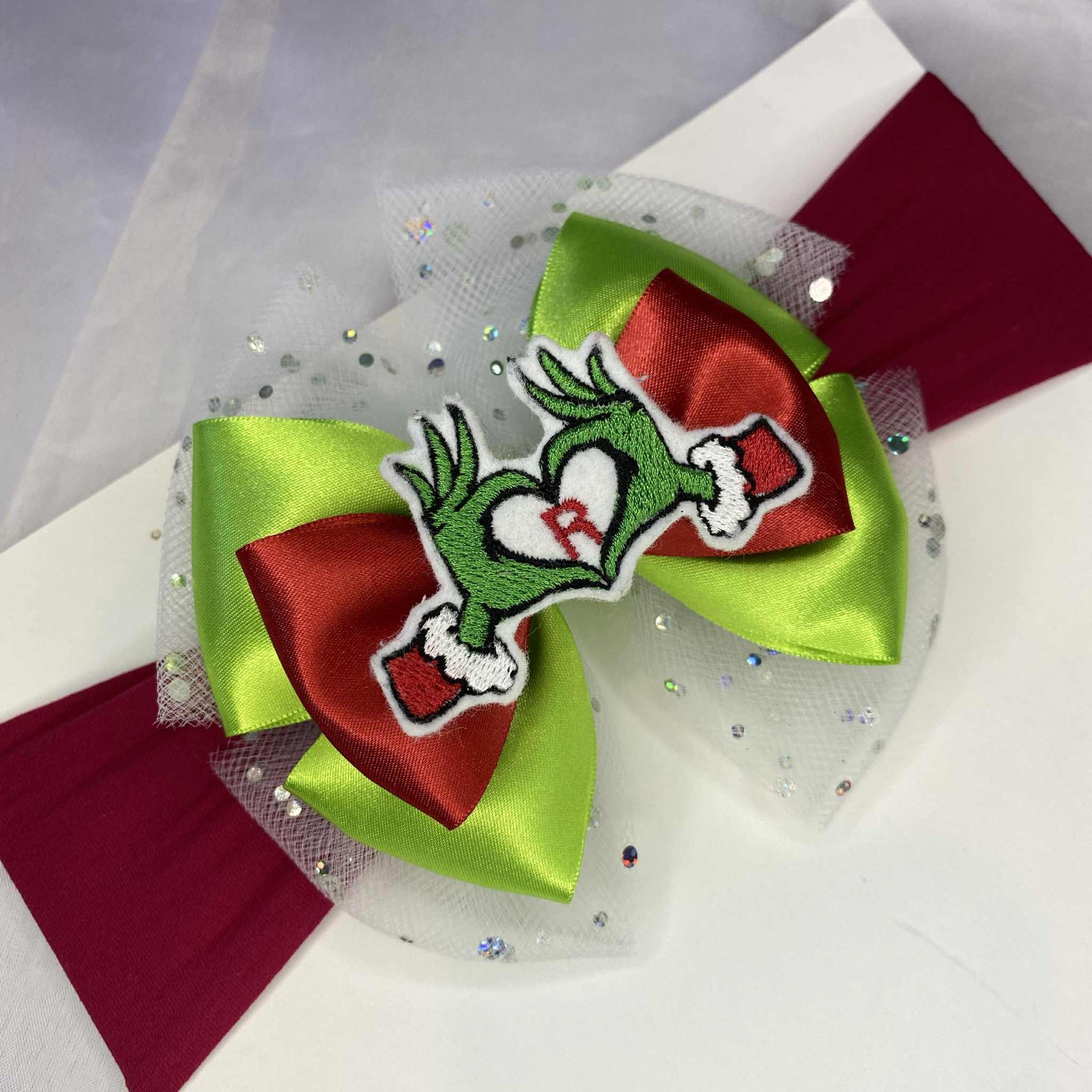 Our exclusive Mr Grinch collection presents the You're a Mean One #1 bow, crafted with luxury satin by hand. It combines silver and white sparkle mesh as a striking backdrop, layered with an apple green satin bow and topped with a rich red satin bow at the front. At its center, a customizable Grinch heart showcases your baby's initial, adding a personalized touch to this expertly designed festive accessory.