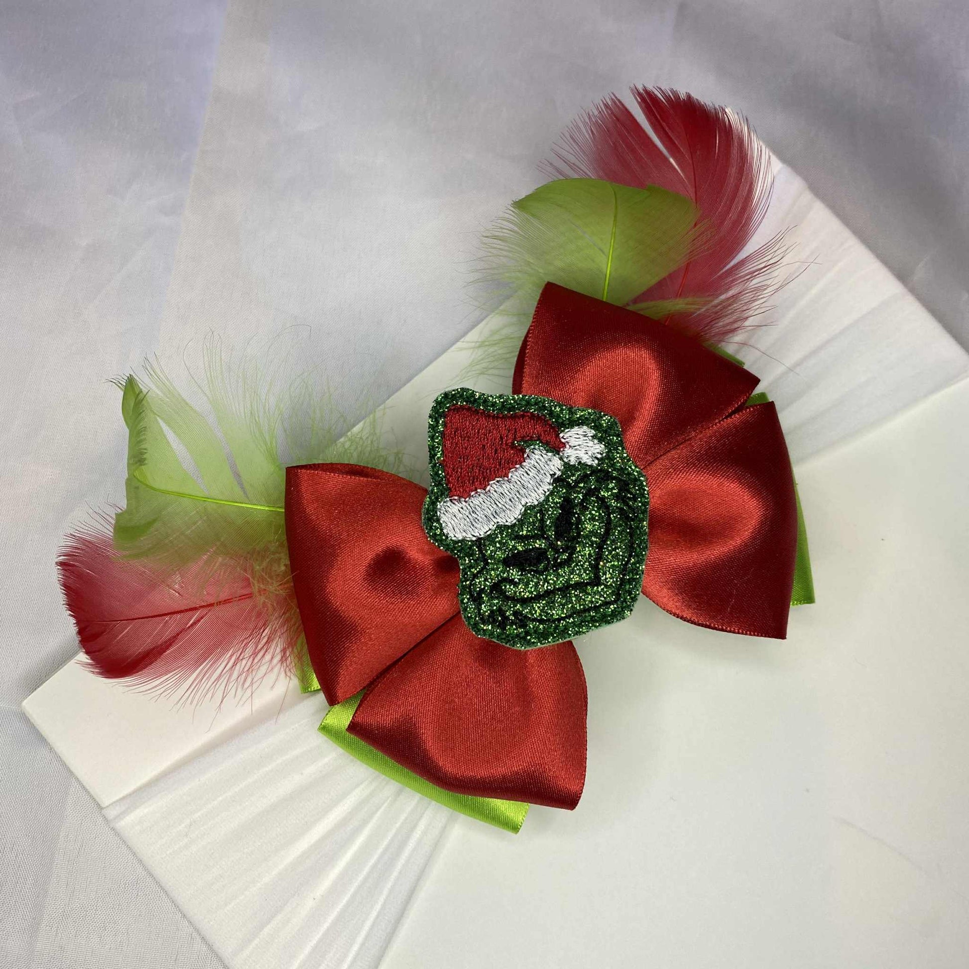 You're A Mean One #3 is a luxurious satin triple-layer handmade bow featuring a crisp apple green bow at the back and a vibrant red bow at the front. Its centerpiece is a sparkling green Grinch adorned with a Santa hat, flanked by elegant red and green feathers. This expertly crafted accessory combines festive colors and textures, making it a distinguished choice to complement your holiday ensemble.